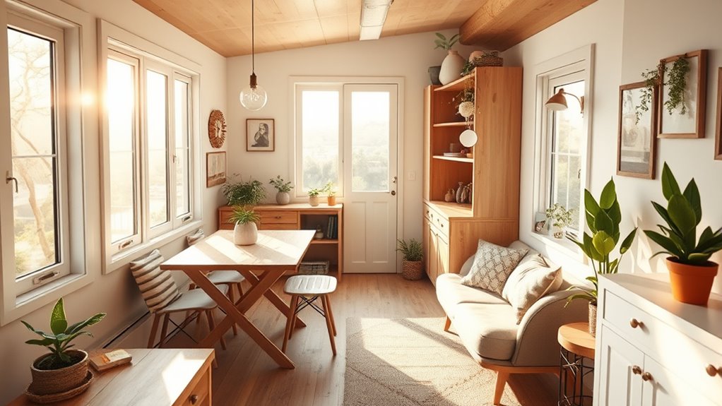 With clever layout tricks, your tiny home becomes a canvas of space and style, transforming cramped corners into open skies. Think of your layout as a refreshing breeze—each design choice a gust that clears the clutter and invites freedom. As you master these tricks, your tiny home will feel like a sanctuary, where every inch breathes life and possibility. Embrace these secrets, and watch your small space blossom into a big, beautiful world.