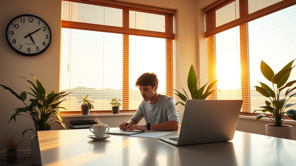 To work with your chronotype, first identify when you feel most alert and energized throughout the day. Schedule your most demanding tasks during these peak times, and save routine activities for when your energy dips. Pay attention to your natural rhythms and adjust your sleep and work routines accordingly. By aligning your schedule with your biological clock, you’ll boost productivity, reduce fatigue, and improve well-being. Keep exploring how to fine-tune your routine for ideal results.