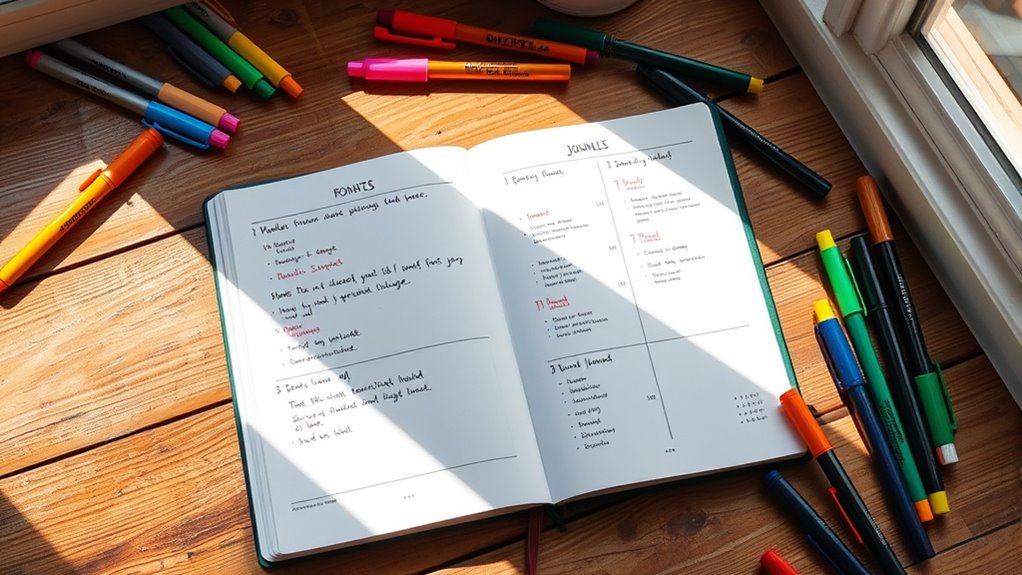 Establishing clear layouts and sections is essential for making your bullet journal effective and easy to use. Well-organized pages help you quickly locate information, whether you’re tracking habits or brainstorming ideas. Use dedicated sections for mind mapping to visualize your goals and ideas, ensuring they stay structured and accessible. Habit tracking sections keep daily routines transparent, motivating you to stay consistent. Incorporate headers and dividers to separate different areas, like upcoming tasks, notes, or reflections. Keep layouts simple yet functional, avoiding clutter that can overwhelm you. By creating distinct sections for different aspects of your life, you’ll prevent chaos and enhance clarity. Clear layouts empower you to navigate your journal effortlessly, making it a true tool for focus and productivity. Additionally, designing your pages with organized water-related sections can inspire a calming and refreshing mindset to support your daily planning. Utilizing vacuums for luxury vinyl plank floors as inspiration for your page designs can introduce a soothing, clean aesthetic that promotes clarity and calmness throughout your journal. Incorporating neuroscience-backed strategies in your page layouts can further reinforce your mental clarity and focus. Including nutrient-rich content in your pages can also reinforce healthy habits and positive routines, further boosting your mental clarity.