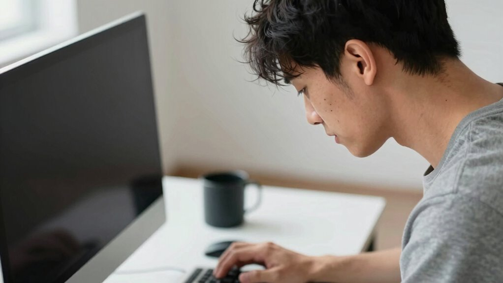 One of the most common mistakes that lead to neck strain is placing your monitor too low. When your screen sits below eye level, you constantly tilt your neck upward, causing discomfort over time. Additionally, neglecting proper color calibration can make it harder to see details clearly, prompting you to lean in or adjust your neck position. Screen glare from improper placement or lighting forces you to squint or move your head to see better, increasing strain. To avoid these issues, watch out for these mistakes: