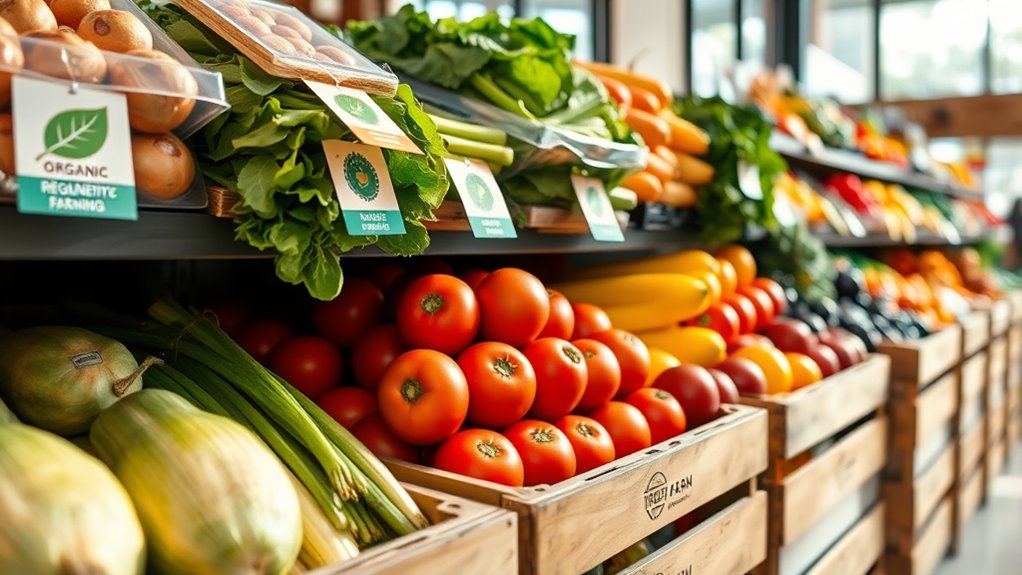 Food labels like organic, regenerative, and local help you pick healthier, more sustainable options. Organic foods are produced without synthetic chemicals and support soil health. Regenerative labels focus on improving land and biodiversity with farming practices that rebuild ecosystems. Local labels indicate food from nearby farms, reducing environmental impact and ensuring freshness. Understanding these labels helps you make mindful choices that benefit your health and the planet. Keep exploring to learn more about what they really mean.