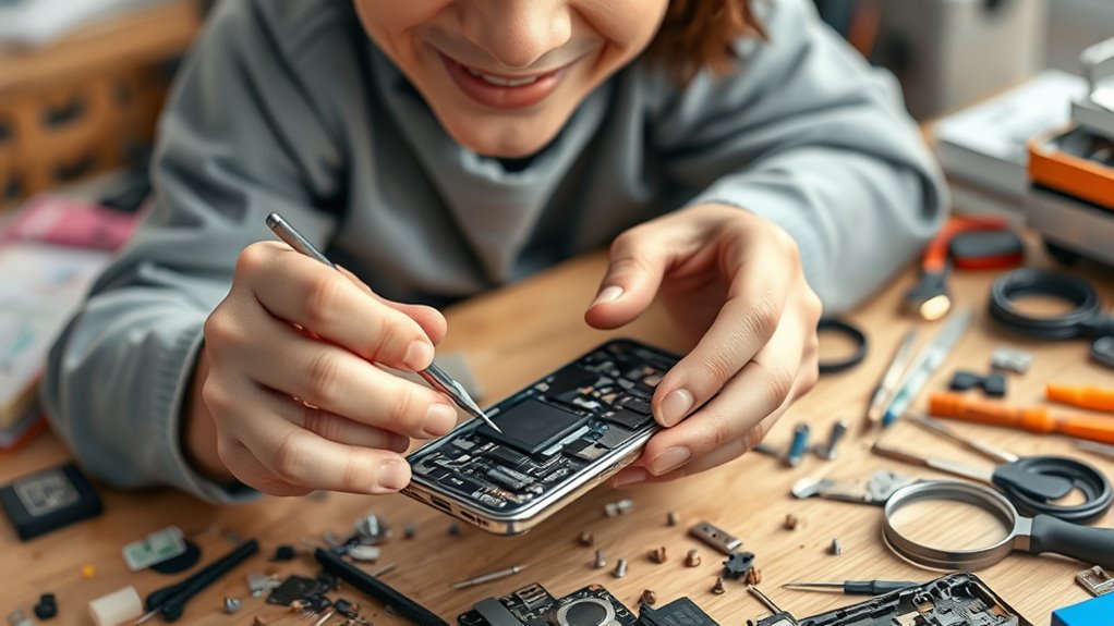 To perform repairs legally, you need essential tools like repair kits and access to DIY manuals. Repair kits include specialized screwdrivers, soldering irons, and replacement parts, making the process easier and compliant with legal standards. DIY manuals guide you step-by-step through repairs, ensuring you follow proper procedures. Having these resources helps you stay within legal boundaries while fixing your devices, empowering you to maintain and repair your gadgets confidently.
