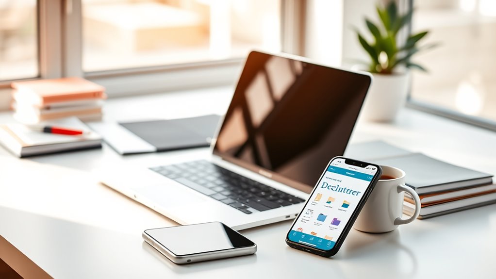 You can use tools like cloud storage services such as Google Drive or Dropbox to organize and back up files easily. Productivity apps like Evernote or Todoist help you sort notes and tasks efficiently. These tools streamline your digital cleanup by reducing clutter and keeping everything accessible. Regularly updating and reviewing your cloud storage and apps guarantees your digital space stays tidy and boosts your overall productivity.