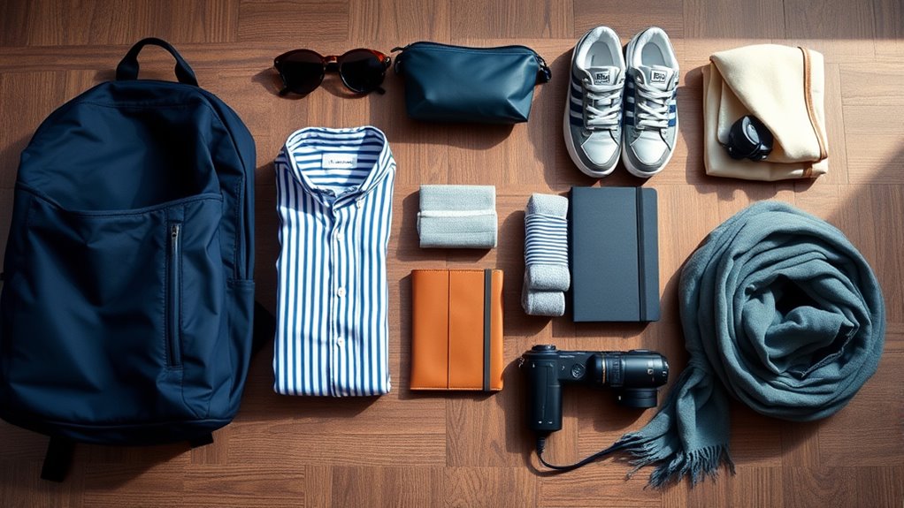 To pack for a 4-day trip with just 10 items, choose versatile clothing like 2 tops, 1 pair of pants or shorts, and a light jacket for layering. Roll your clothes to save space and pack toiletries in a small pouch. Include essentials like your identification, travel documents, and daily necessities such as a water bottle and snacks. Keep things organized in dedicated compartments. Want more efficient tips? Keep exploring to master the art of minimalist packing.