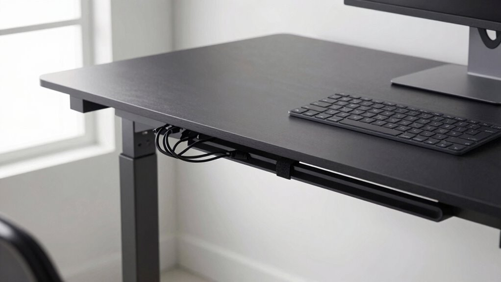 Securing and concealing cables is key to maintaining a tidy and efficient workspace, especially when using a sit-stand desk. Proper cable labeling helps you identify cords quickly, reducing clutter and confusion. Adjusting cord length ensures cables don’t hang loosely or cause tripping hazards. Use cable clips, sleeves, or raceways to keep cables hidden along the desk frame or walls. Keep cords organized by grouping similar ones together. Here’s a quick guide: