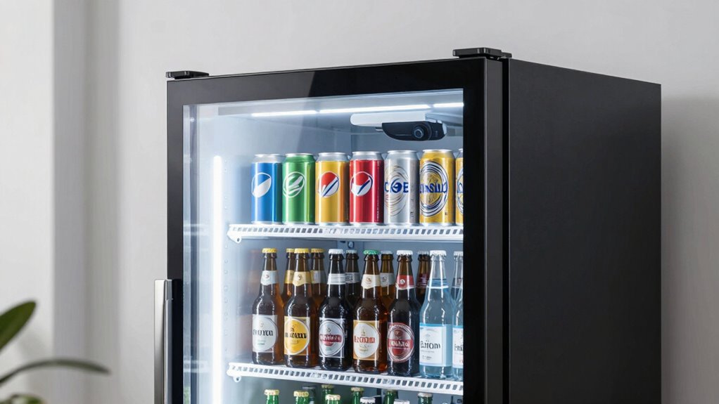 These beverage refrigerators with glass doors are quite energy-efficient, especially newer models with advanced insulation and LED lighting. I’ve noticed that many come with energy-saving features like automatic defrost and efficient compressors, which help reduce power consumption. While they do use more energy than solid-door units, their transparent doors let me see the contents without opening, saving energy overall. Regular maintenance, like cleaning seals, also keeps them running efficiently.