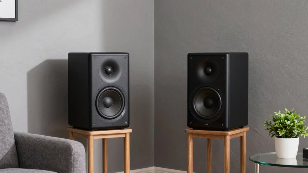 Setting a clear budget is essential when choosing premium bookshelf speakers for small rooms, as it helps you focus on options that offer the best value within your price range. It narrows down choices and guarantees you don’t overspend while still getting quality sound. Affordable options can still deliver impressive audio, but they might have limitations in power and bass response. Higher-priced models usually use better materials, advanced drivers, and provide clearer sound, which can be especially important in small spaces. Your budget may also influence features like wireless connectivity or customizable sound modes. Striking a balance between cost, sound performance, and durability is key to selecting speakers that suit your needs without breaking the bank.