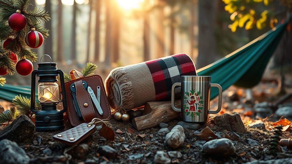 To personalize camping gifts for men, I love adding his name or a special message on gear like engraved pocket knives, custom patches, or monogrammed mugs. You can also choose items that match his interests, like a favorite color or hobby-related accessories. Personal touches make the gift unique and memorable, showing you put thought into selecting something that’s both practical and meaningful for his outdoor adventures.