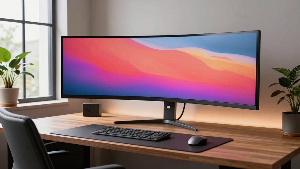 A higher refresh rate and faster response time can considerably impact your experience with a curved ultrawide monitor, especially during fast-paced tasks like video editing or gaming. A refresh rate of 120Hz or 165Hz delivers smoother motion and reduces blur, making fast movements look more natural. This is particularly beneficial for gaming, where fluid visuals enhance immersion. Response time, measured in milliseconds, shows how quickly pixels change colors; lower response times, like 1ms, minimize ghosting and motion artifacts, resulting in clearer images during quick scenes. Combining high refresh rates with low response times creates a more fluid and responsive display, ensuring sharp, natural visuals during rapid actions. This synergy improves both professional workflows and entertainment experiences, making your monitor more versatile and enjoyable.