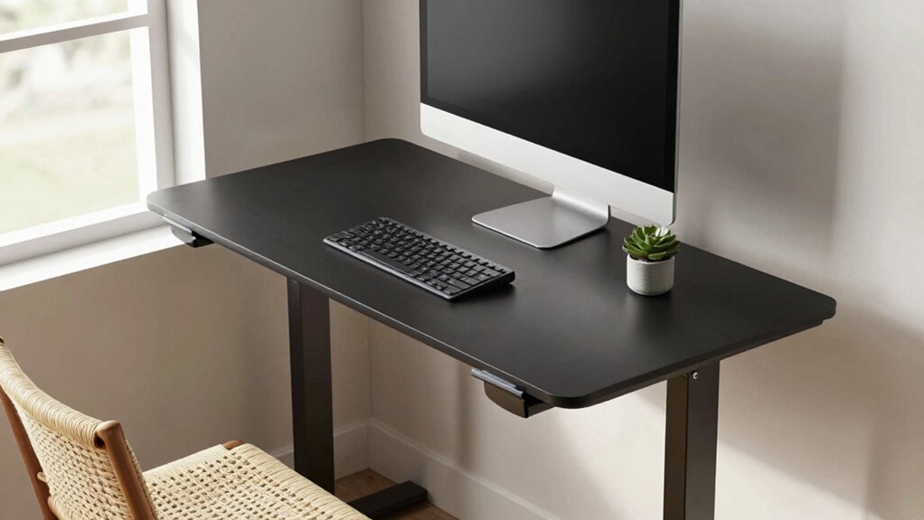 Considering how easy a desk is to assemble is important, but safety features guarantee that your workspace remains secure during everyday use. Many electric standing desks include rounded corners to prevent injuries if you bump into them. Safety locks on control panels help avoid accidental height changes, especially if kids are around. Overload protection automatically stops the motor if the desk exceeds its weight limit, preventing damage or tipping. Anti-pinch technology is another useful feature, stopping movement if an obstruction or body part is detected. Additionally, desks made with low-VOC or environmentally safe materials contribute to healthier indoor air quality, reducing exposure to harmful chemicals. These safety features not only protect you but also extend the lifespan of your desk, making your workspace safer and more reliable.