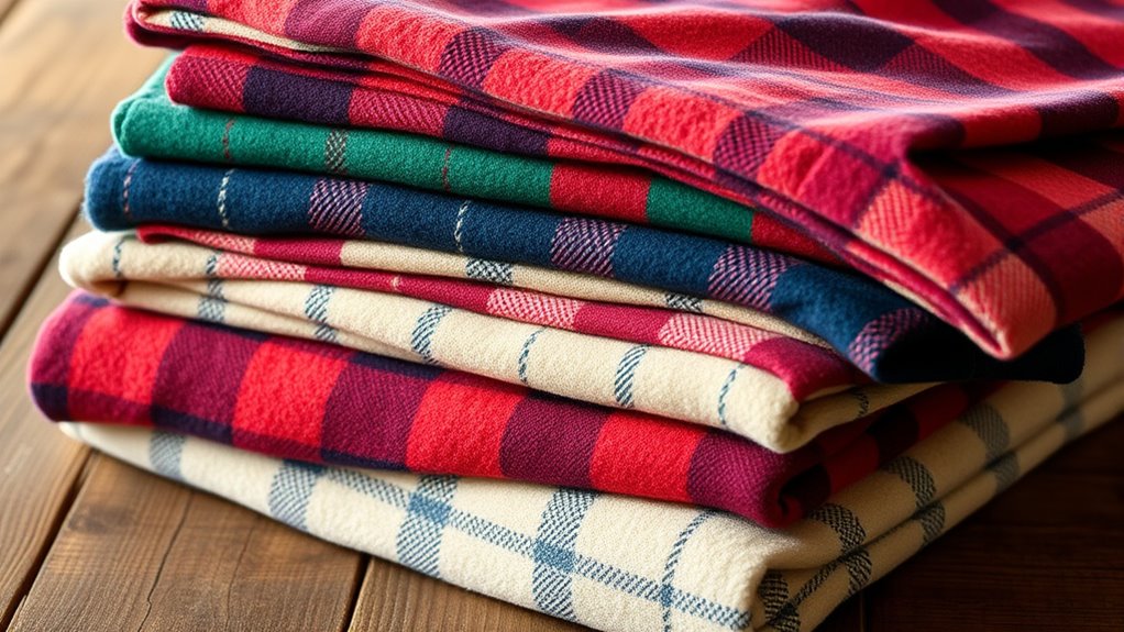 When choosing flannel sheets for year-round comfort, it’s important to contemplate their seasonal versatility, which depends on factors like fabric type, weight, and finish. I look for sheets labeled as all-season or designed for multiple temperatures, ensuring they adapt to changing weather. Breathable materials, like 100% cotton flannel, help balance warmth and ventilation, preventing overheating. I pay attention to fabric weight, around 160 GSM, which offers a comfortable middle ground for different seasons. Double brushing or special finishes enhance softness without sacrificing breathability, making sheets more versatile. Ultimately, I choose colors and designs that complement my decor, allowing the sheets to suit various seasonal styles while remaining functional throughout the year.