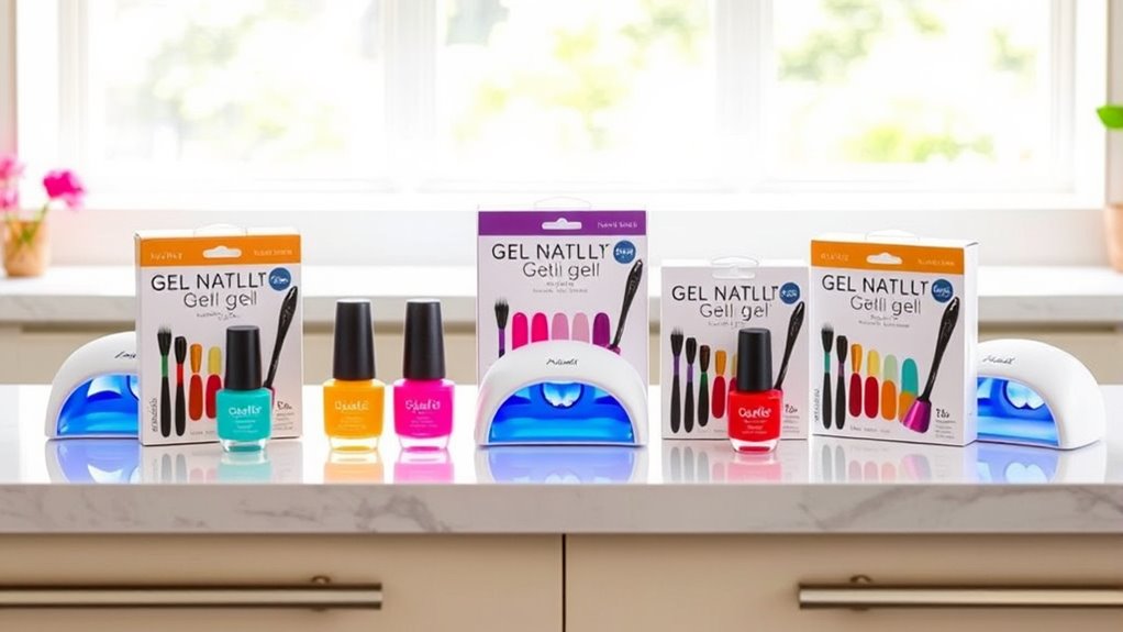 When selecting a gel nail kit, prioritizing safety features and quality materials is essential to protect your skin and nails. I recommend choosing kits made from non-toxic, hypoallergenic ingredients to reduce the risk of irritation or allergic reactions. Safety features like automatic shut-off lamps and timers help prevent overexposure to UV or LED light, which can be harmful. Look for products with professionally tested formulas that are free from harmful chemicals such as formaldehyde, toluene, and DBP. Clear instructions for application, curing, and removal are vital to avoid nail damage. Additionally, opt for kits that carry safety certifications or quality assurance labels, ensuring the materials used meet industry standards for safe at-home use.