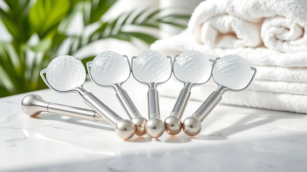 When selecting an ice roller, ease of use and grip are crucial for a smooth, comfortable experience. An ergonomic handle offers comfort and control, reducing hand fatigue during use. Non-slip handles provide stability, especially when applying gentle pressure or working with moist skin. A lightweight design makes maneuvering effortless, allowing for precise massage techniques without strain. Textured or rubberized grips prevent slipping even if your hands are cold or damp, ensuring safe and consistent use. Simple, intuitive designs make operation quick and effortless, encouraging regular routine use. These features help you focus on the benefits of your skincare routine rather than struggling with the tool. Prioritizing ease of use and grip enhances your overall experience and ensures you get the most out of your ice roller.