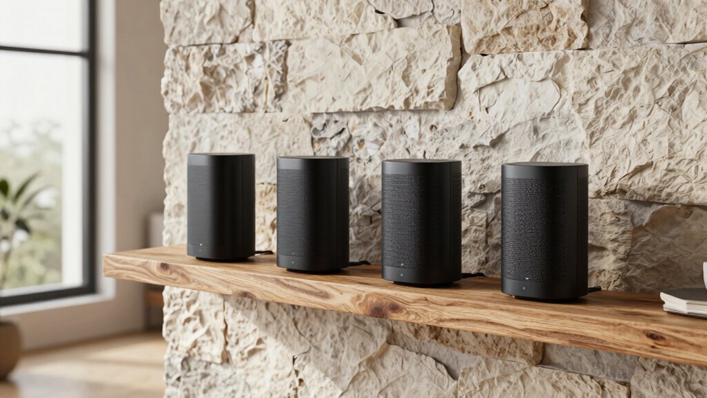 When selecting a mesh WiFi system for thick walls, understanding the technology behind it is crucial. Mesh network technology uses multiple interconnected nodes to create a seamless WiFi system that broadens coverage and minimizes dead zones. Its architecture enables devices to connect to the strongest node automatically, guaranteeing consistent signal strength across dense barriers. Advanced systems support features like AI-Roaming and Multi-Link Operation (MLO), which optimize connections for better performance in tough environments. Many mesh systems incorporate dedicated backhaul channels or wired backhaul options, helping maintain high speeds despite obstacles like thick walls. The seamless handoff between nodes ensures devices stay connected without interruption, even when moving between areas. This technology is indispensable for achieving reliable, high-performance WiFi in challenging spaces.