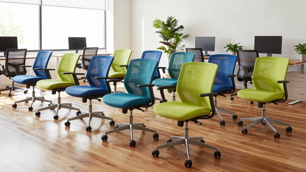 Material sustainability is a significant factor to contemplate when selecting saddle chairs for standing desks, as it impacts both environmental health and long-term usability. I look for chairs made from eco-friendly materials like recycled polyester, PEFC-certified wood, or recycled polypropylene, which help reduce our ecological footprint. Choosing sustainable fabrics and finishes also minimizes VOC emissions, supporting healthier indoor air quality. Durable, recyclable materials not only extend the chair’s lifespan but also make disposal easier at the end of its life. Certifications such as PEFC, FSC, or GREENGUARD are great indicators that the materials meet strict sustainability standards. Overall, selecting environmentally responsible materials guarantees I invest in a product that’s both kind to the planet and built to last.
