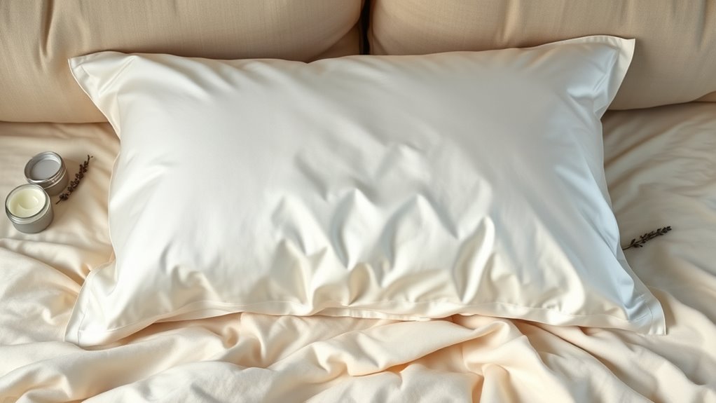 Are you aware of the certifications that guarantee your silk pillowcase is safe and skin-friendly? Look for OEKO-TEX certification, which confirms the product is free from harmful substances and safe for skin contact. It’s also essential to verify if the pillowcase is made from high-grade silk, like 6A mulberry silk, known for its hypoallergenic and gentle qualities. Certifications that attest to low chemical content and adherence to safety standards help reduce the risk of irritation, especially for sensitive skin. Additionally, choose pillowcases that highlight skin benefits, such as reducing wrinkles or maintaining moisture. Always check that the product’s labeling emphasizes its natural, non-toxic, and hypoallergenic qualities—these certifications give me confidence that the pillowcase will support my skin’s health overnight.