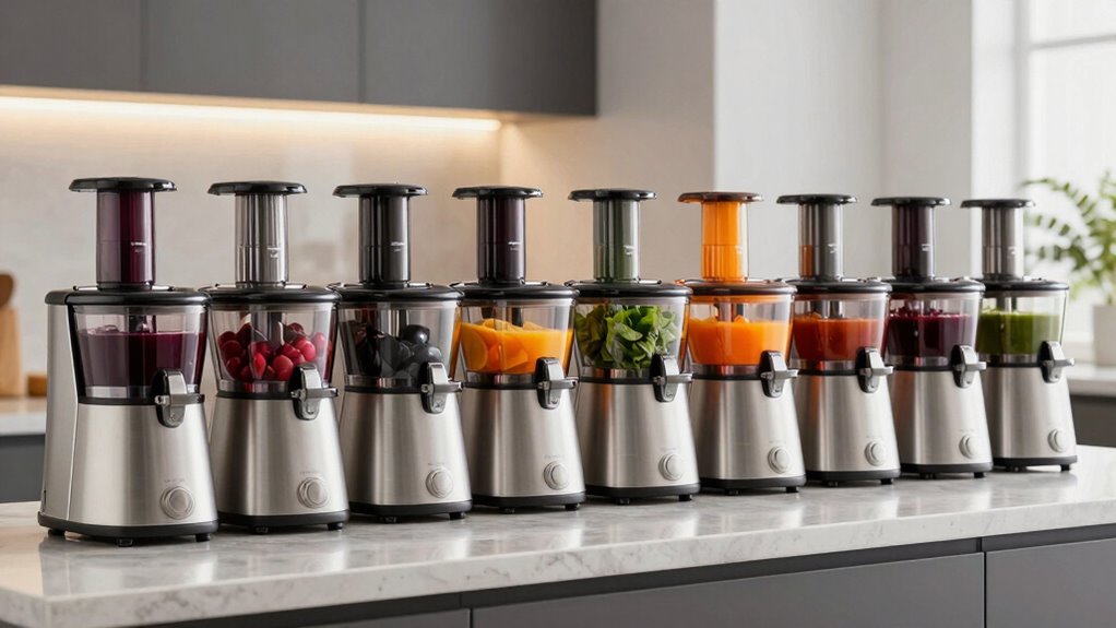 I’ve found the top 15 slow juicers for 2026, featuring models with powerful, durable motors, large feed chutes, and versatile functions like nut milk and sorbet making. These premium juicers prioritize nutrient preservation, juice yield, and ease of cleaning with BPA-free materials and safety features. Whether you want sleek designs or multi-purpose setups, there’s plenty to choose from. Keep exploring to discover which one best fits your needs and how they stand out.