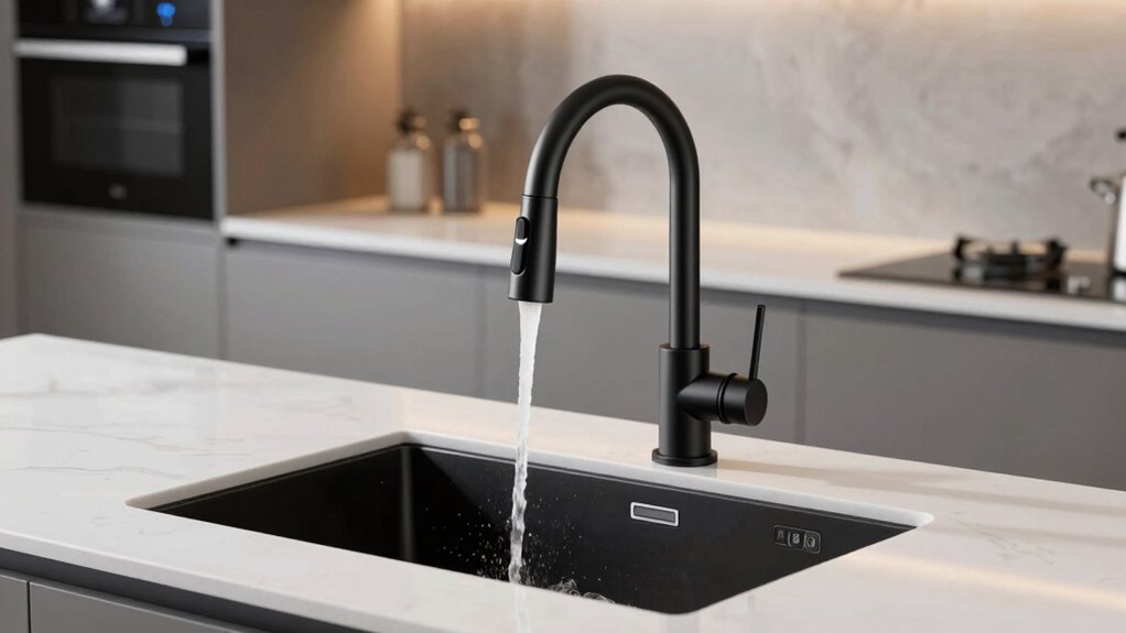 Smart features can particularly enhance how you use your touchless kitchen faucet, making your daily routines more convenient and efficient. Voice control, smartphone app integration, and customizable presets let you fine-tune water temperature and flow with ease. LED temperature indicators provide visual cues, warning you of hot or cold water to boost safety. Automatic auto-off timers help save water by shutting off the faucet after inactivity. Integration with virtual assistants like Alexa or Google Assistant enables hands-free, voice-activated commands. Additionally, adjustable sensors with customizable sensitivity prevent accidental activations and improve responsiveness. These smart features not only simplify your kitchen tasks but also add a layer of safety and efficiency, making your smart faucet a truly advanced and user-friendly addition to your home.