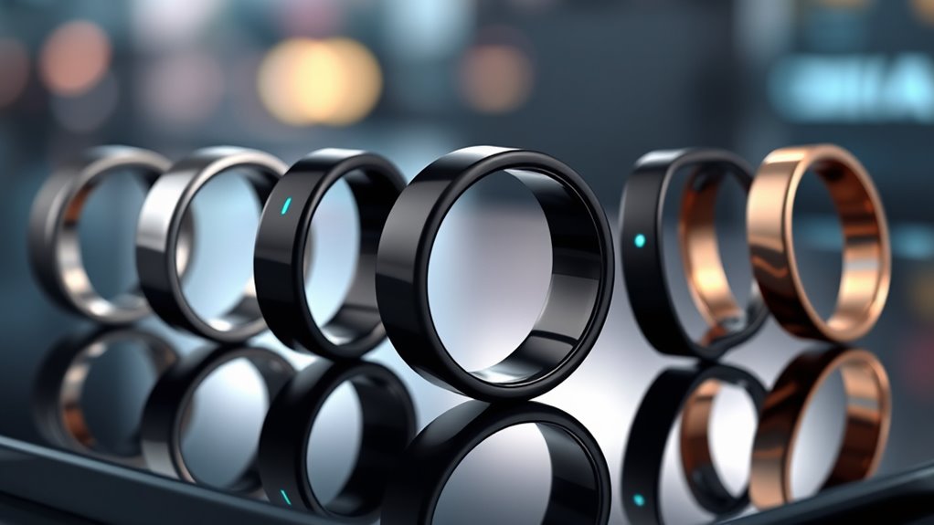 Smart rings are designed to provide a wide range of health metrics that help you understand your overall wellness better. They typically track sleep quality, heart rate, blood oxygen levels, activity levels, and stress indicators, offering a thorough picture of your health. Many devices monitor over 50 metrics, giving detailed insights into both overall wellness and specific concerns. Some advanced rings even track women’s health metrics, like menstrual cycles and pregnancy-related data, for personalized management. More sophisticated models measure vital signs such as blood pressure and body temperature continuously, enabling real-time health monitoring. However, the accuracy of these metrics depends on sensor quality and calibration. Choosing a ring with reliable tracking capabilities is essential for meaningful health insights and effective fitness management.