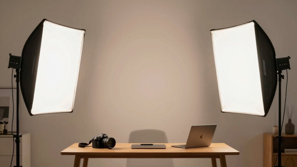 Think of your softbox as a delicate plant that needs gentle care. I regularly check for dust and wipe down the exterior with a soft cloth. I also inspect the bulbs for signs of wear and replace them when needed. Making certain the stand stays stable and cords are tidy prevents accidents. Proper maintenance keeps my lighting kit shining brightly, just like tending to a cherished plant ensures it thrives in my home studio.