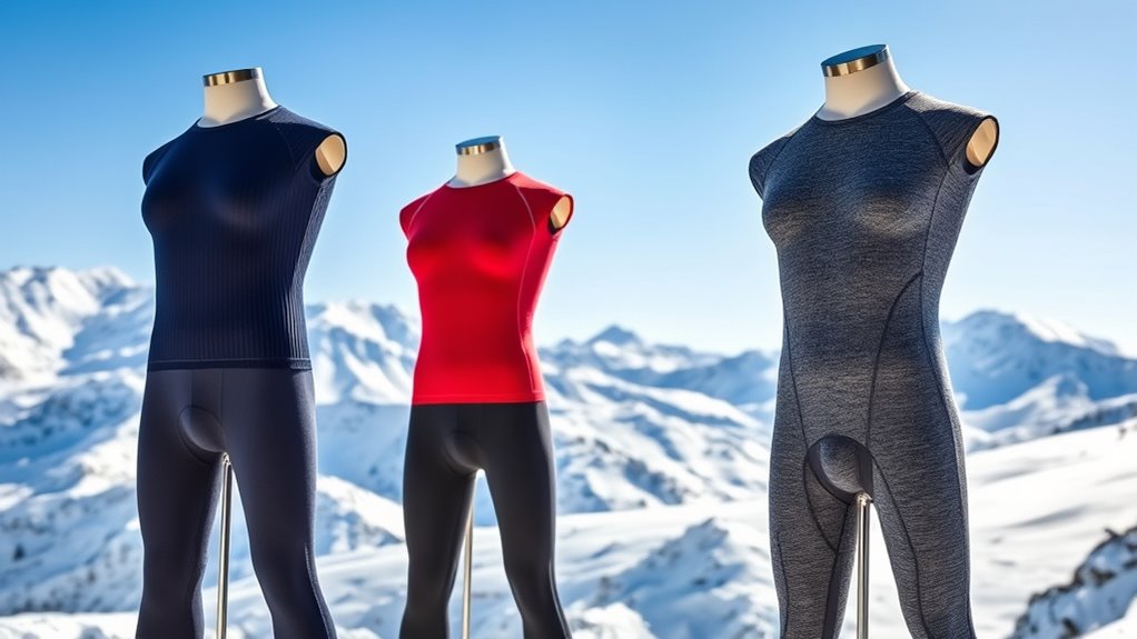 If you want to stay warm and dry on the slopes in 2025, I recommend looking at thermal underwear made from moisture-wicking, breathable fabrics like polyester blends with spandex for flexibility. The best options should offer high insulation, a snug fit, and quick-drying features to prevent chills during intense activity. Seamless designs and UV protection add extra comfort and safety. Keep exploring to find the perfect thermal layer for your winter adventures.