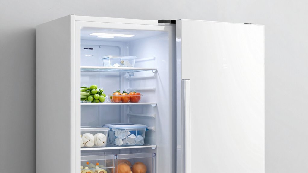 Frost-free technology offers several advantages that can make your freezer experience more convenient and reliable. It automatically activates a defrost cycle that melts away ice buildup, so you don’t have to manually defrost your freezer. This helps maintain a consistent temperature, preventing ice from interfering with proper cooling. Plus, a fan circulates air evenly throughout the freezer, ensuring uniform temperature distribution and preventing cold spots. Eliminating ice buildup also preserves the integrity of the door seals, helping to maintain ideal storage capacity over time. While frost-free models might use slightly more energy due to the defrost cycle, the convenience of not having to defrost manually and the improved temperature stability often outweigh this. Overall, frost-free technology enhances ease of use and freezer longevity.