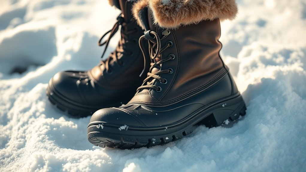 Choosing the right insulation is essential because it directly affects how warm my feet stay during the coldest days. I look for boots with materials like Thinsulate or Thermolite, which can keep my feet warm even in temperatures as low as -26°C (-15°F). The thickness and material of the lining, such as microfleece or faux fur, also matter because they influence heat retention. I make sure the insulation is evenly distributed to avoid cold spots and ensure consistent warmth across my feet. Waterproof construction combined with good insulation prevents cold water from seeping in, keeping my feet dry and warm. Proper insulation layers allow me to stay comfortable outdoors for longer, even in harsh winter conditions.