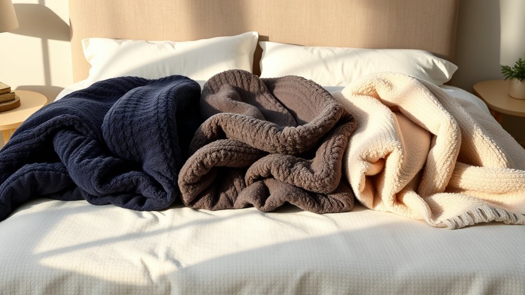 When it comes to staying comfortable with a weighted blanket, temperature regulation is just as important as breathability and fabric choice. I recommend looking for blankets made with breathable materials like cotton or microfiber, which help airflow and prevent overheating. Some blankets offer features like moisture-wicking or cooling glass beads to keep you comfortable during warmer months. Thinner, multi-layered designs can improve heat dissipation and reduce heat retention, making them a good choice for those prone to sweating. Reversible blankets with dual-sided fabrics are also handy, allowing you to switch between warmer and cooler surfaces. Avoid overly heavy or dense blankets in hot climates, as they can trap heat and cause discomfort, undermining the calming effects you’re seeking.